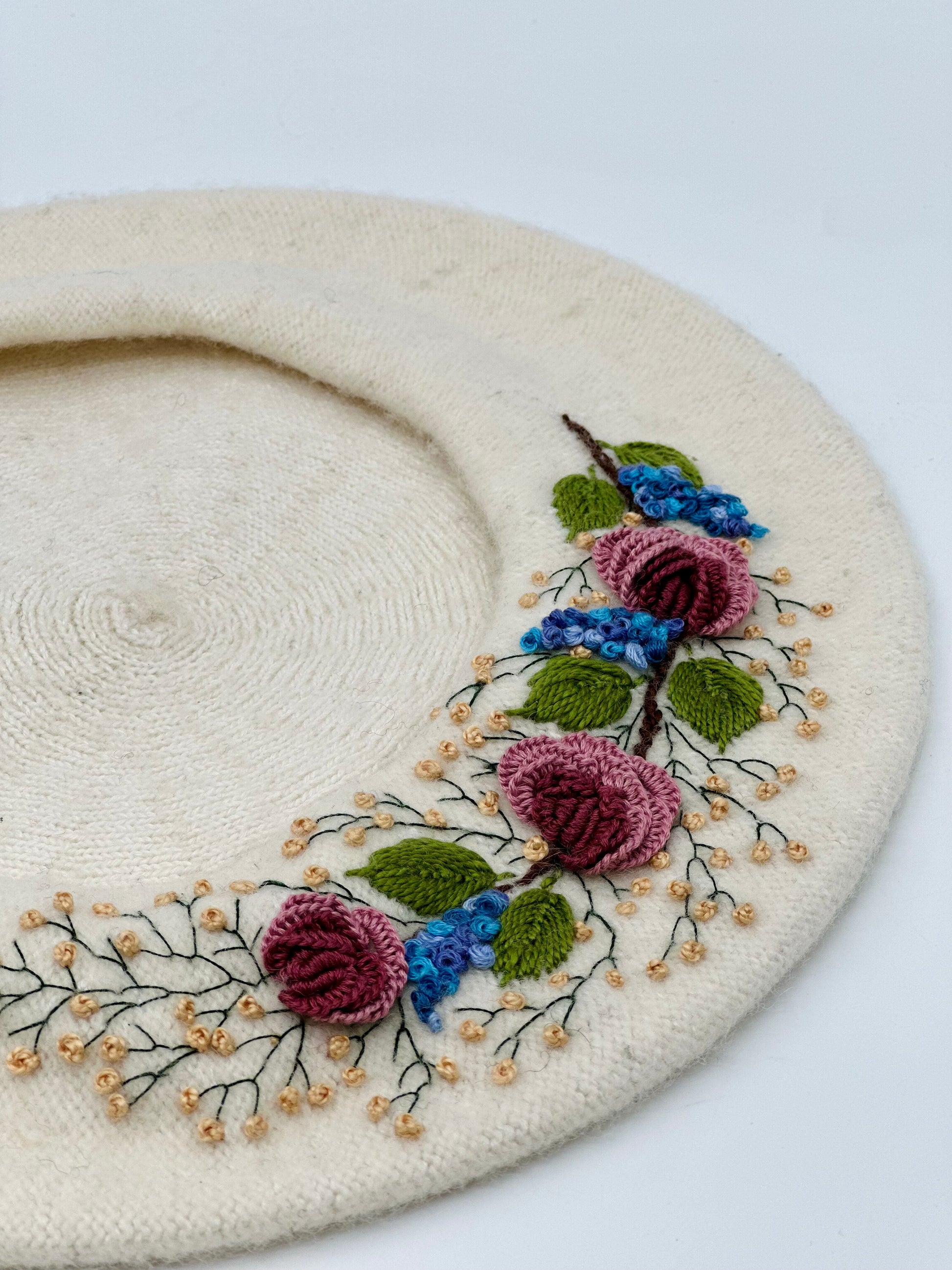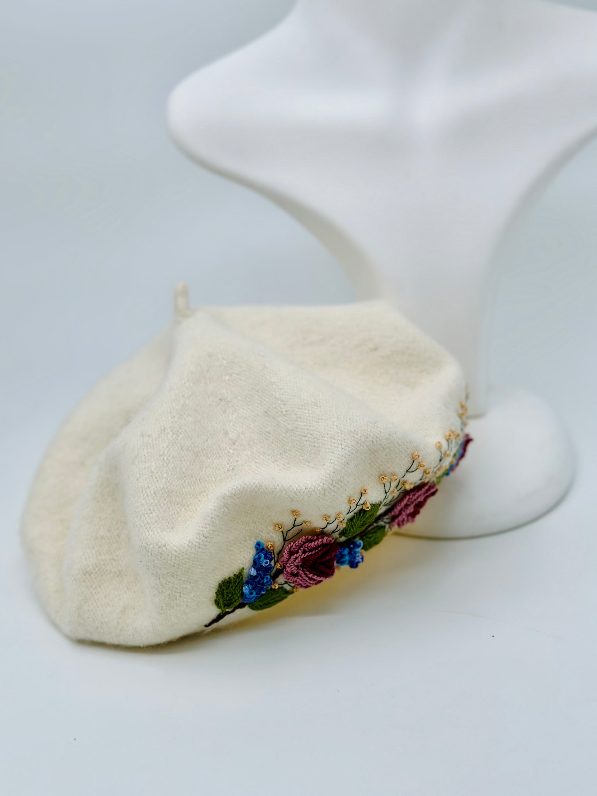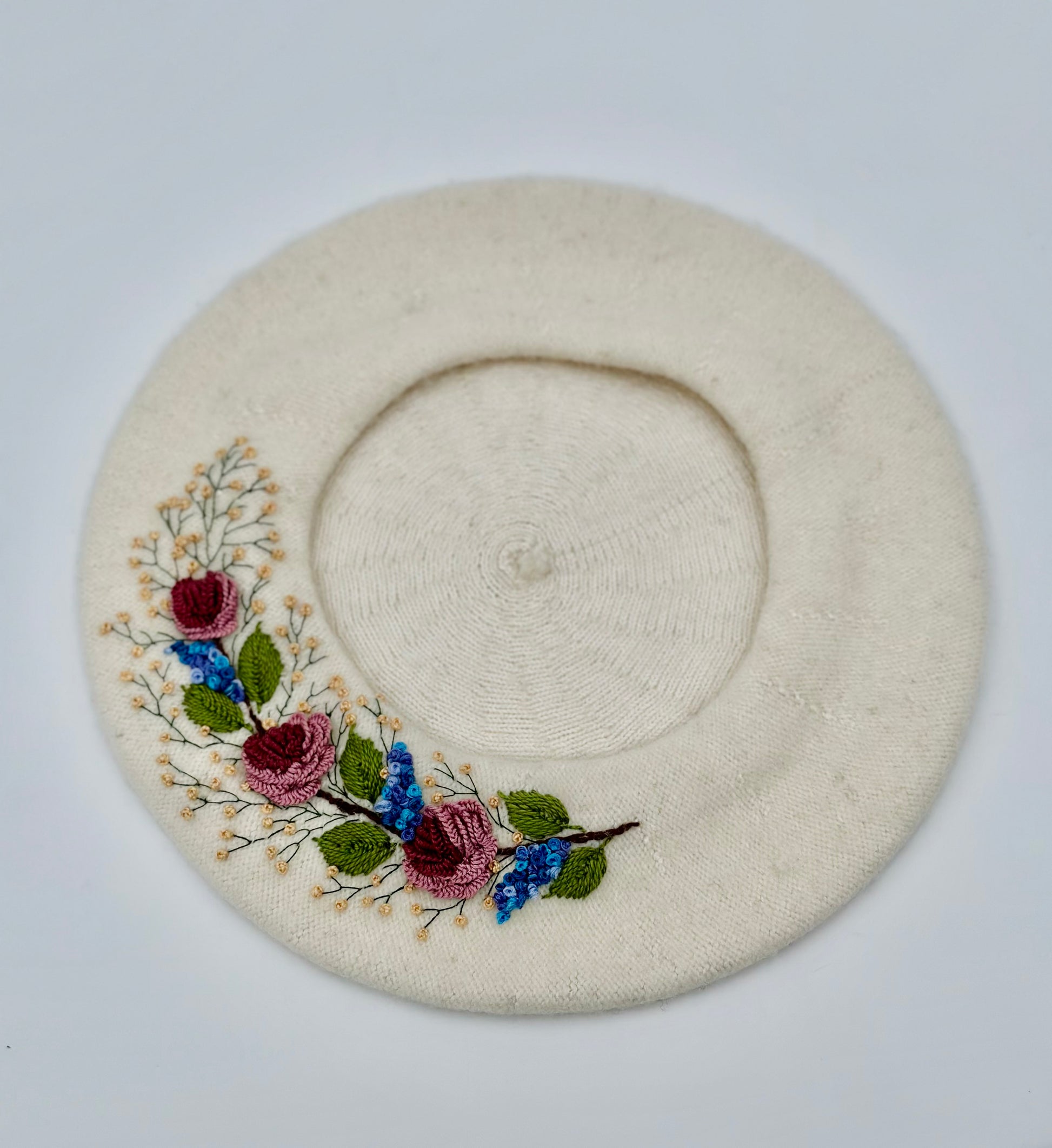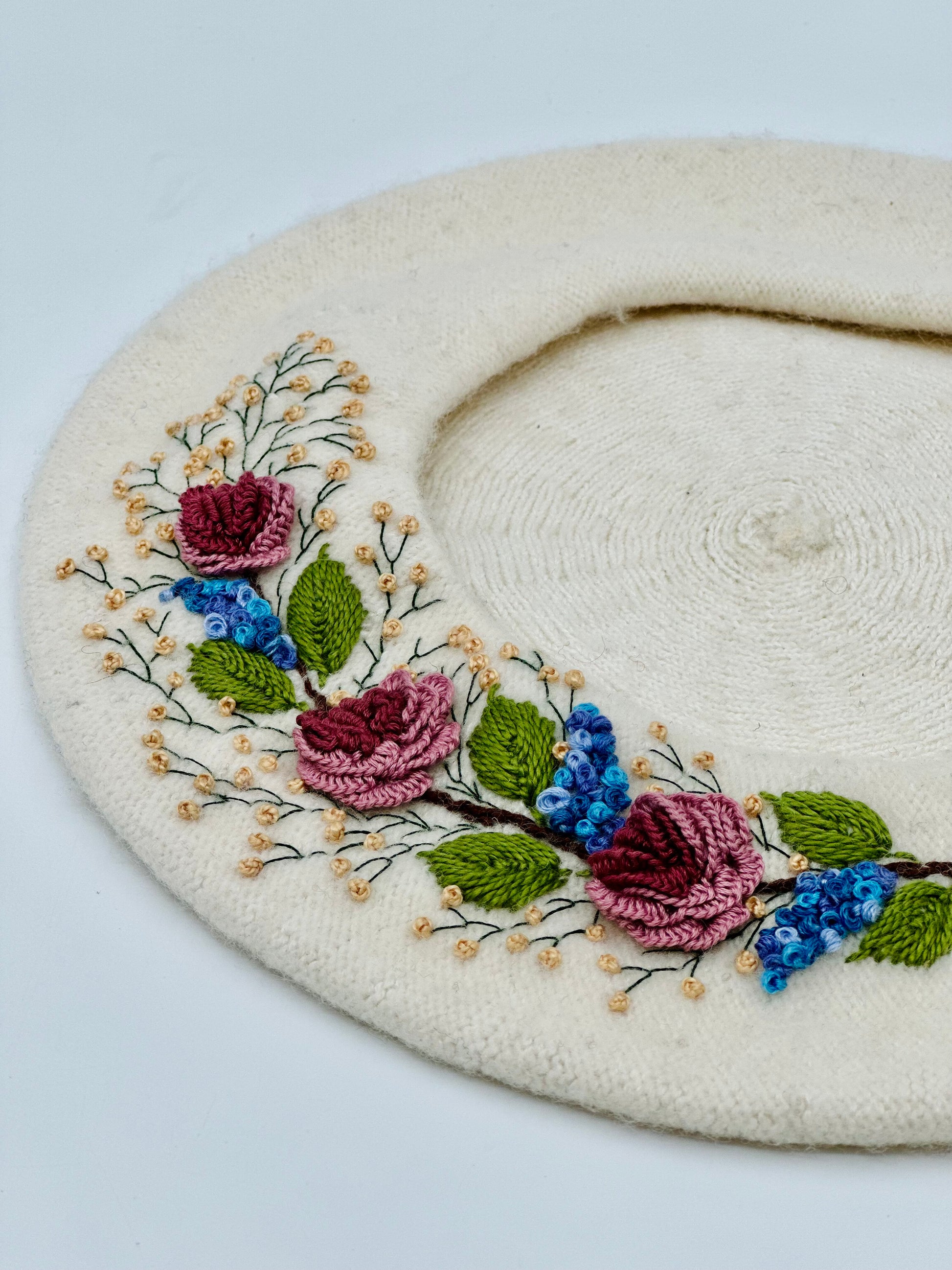 Beretă din lână, brodată manual. Lucrată atent și cu migală, broderia de mână este foarte migălos de realizat. Nu folosim mașini de brodat, ci doar ac și ață specială pentru broderie.