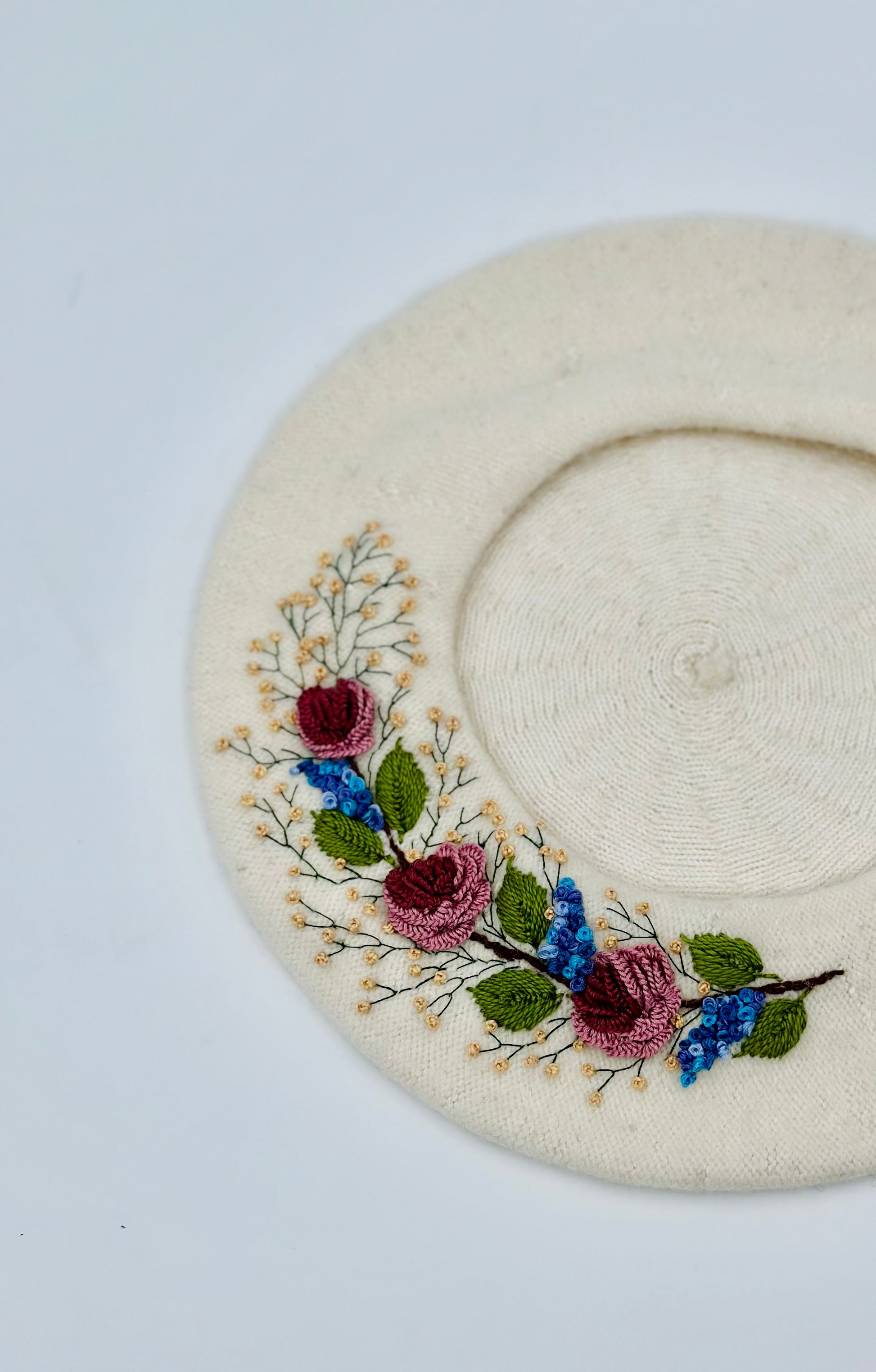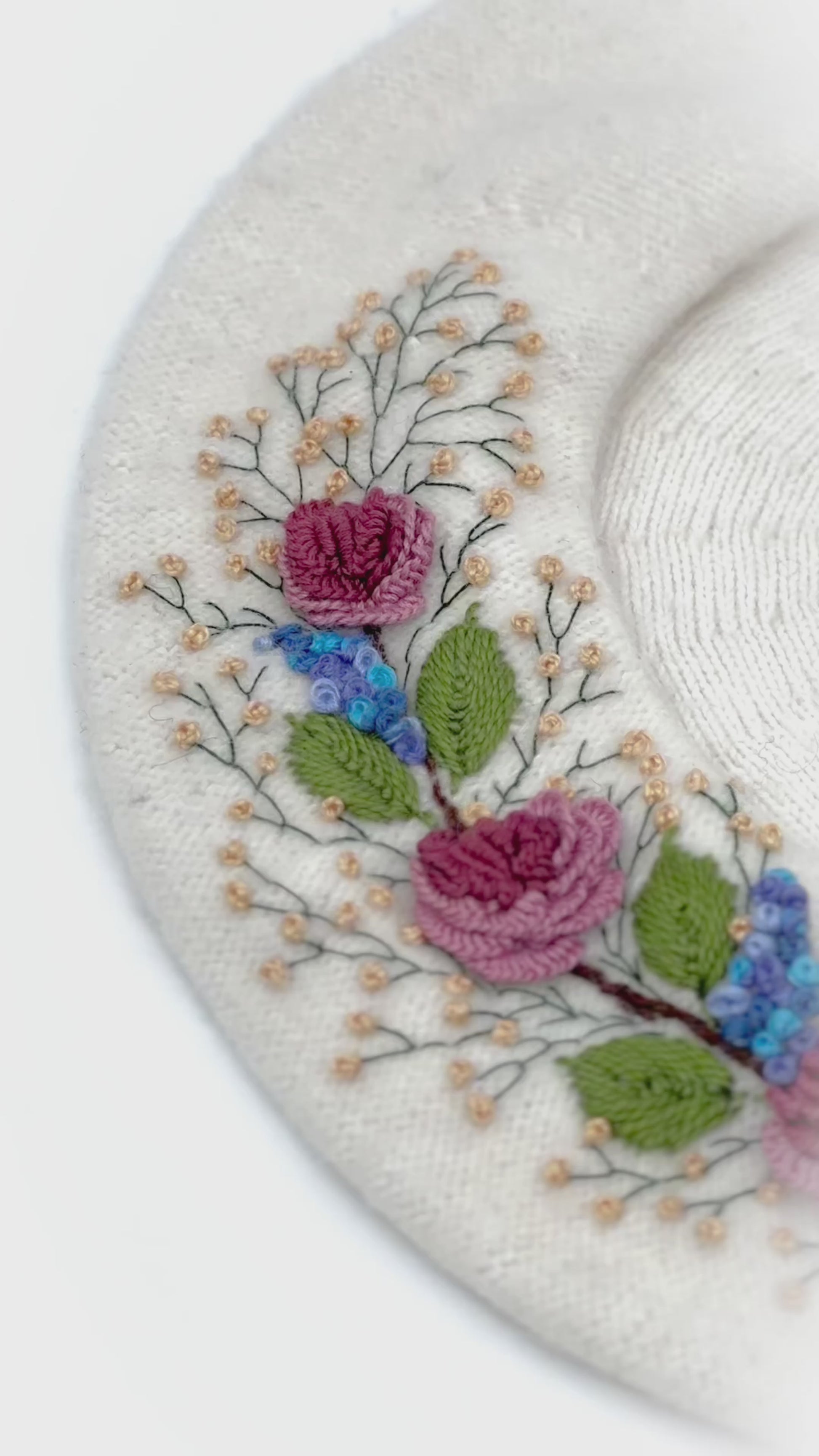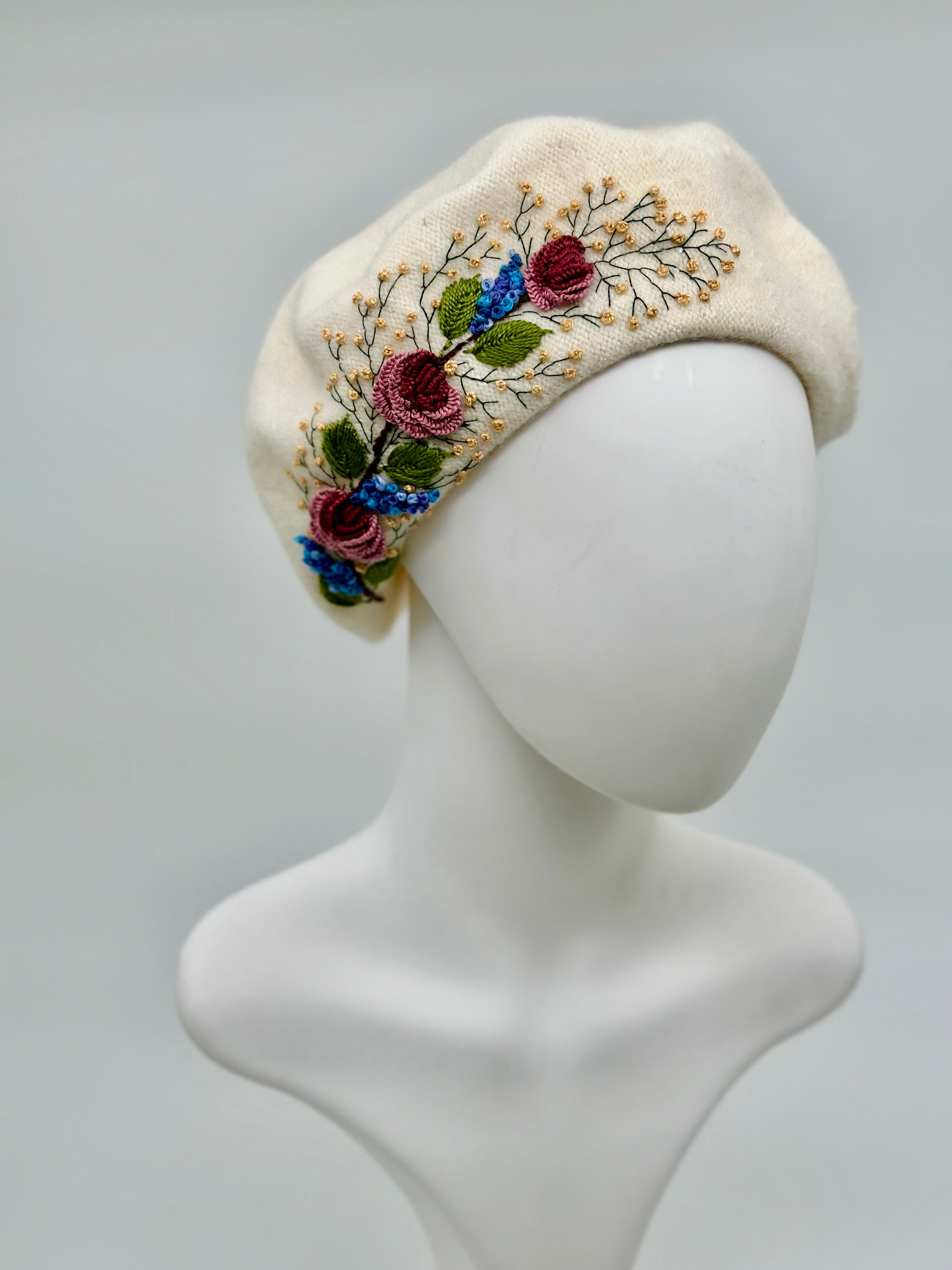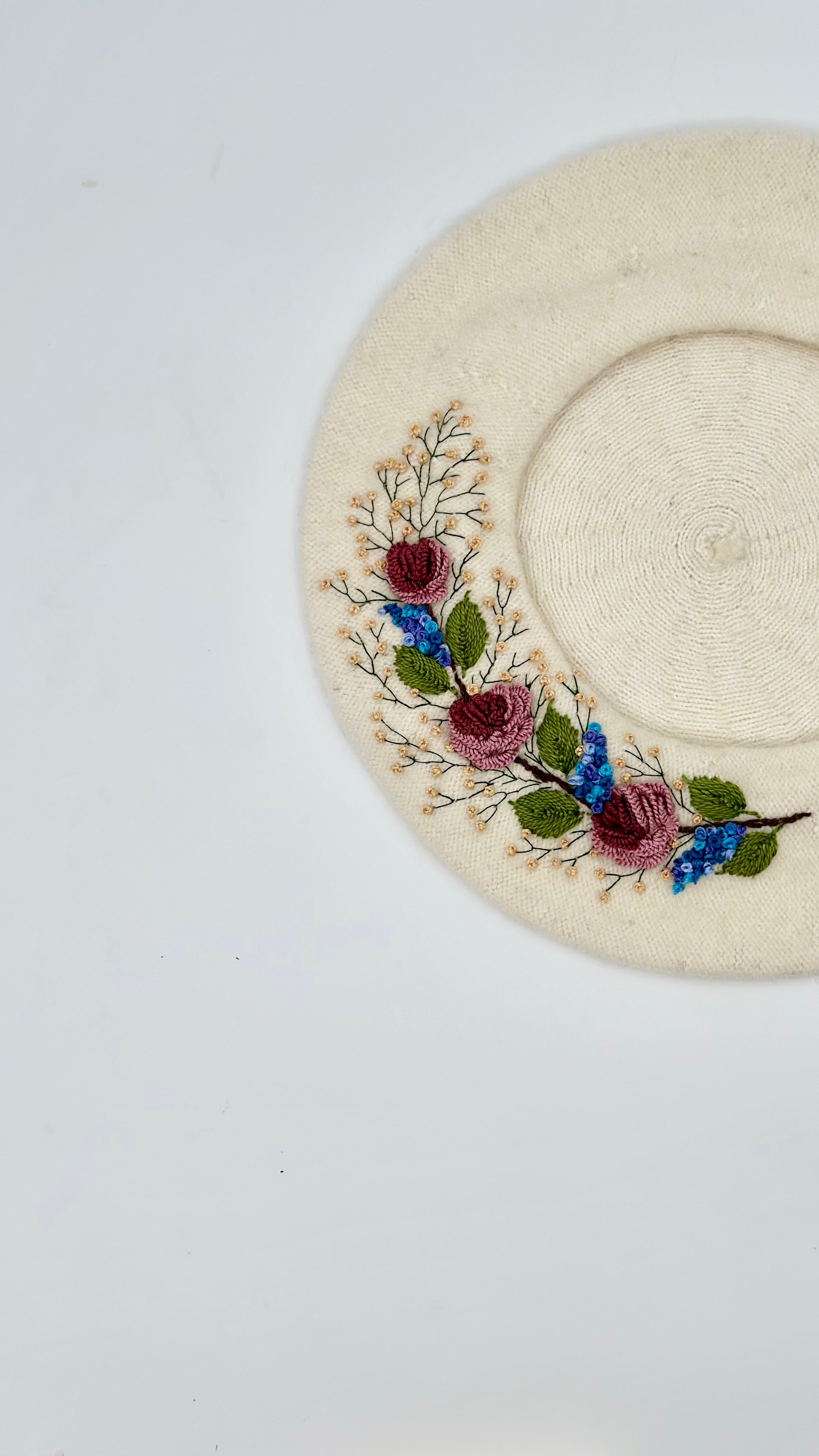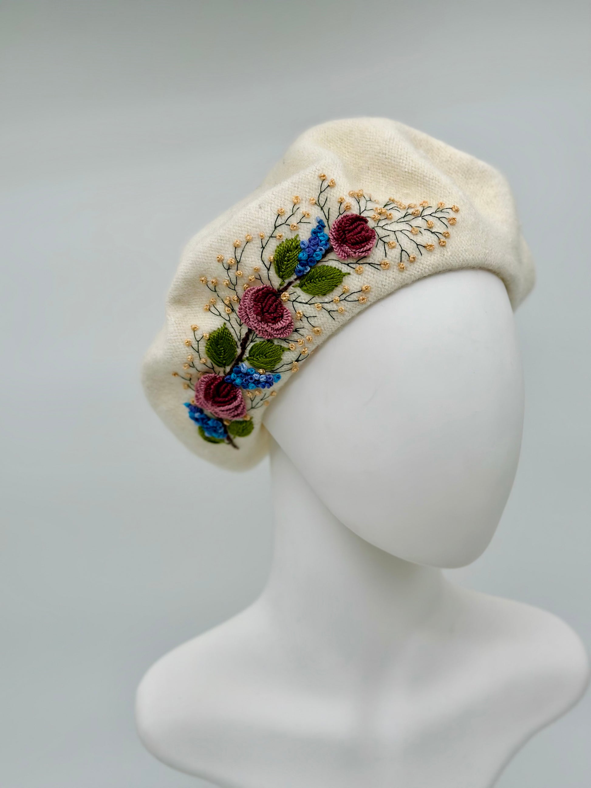 Beretă din lână, brodată manual. Lucrată atent și cu migală, broderia de mână este foarte migălos de realizat. Nu folosim mașini de brodat, ci doar ac și ață specială pentru broderie.