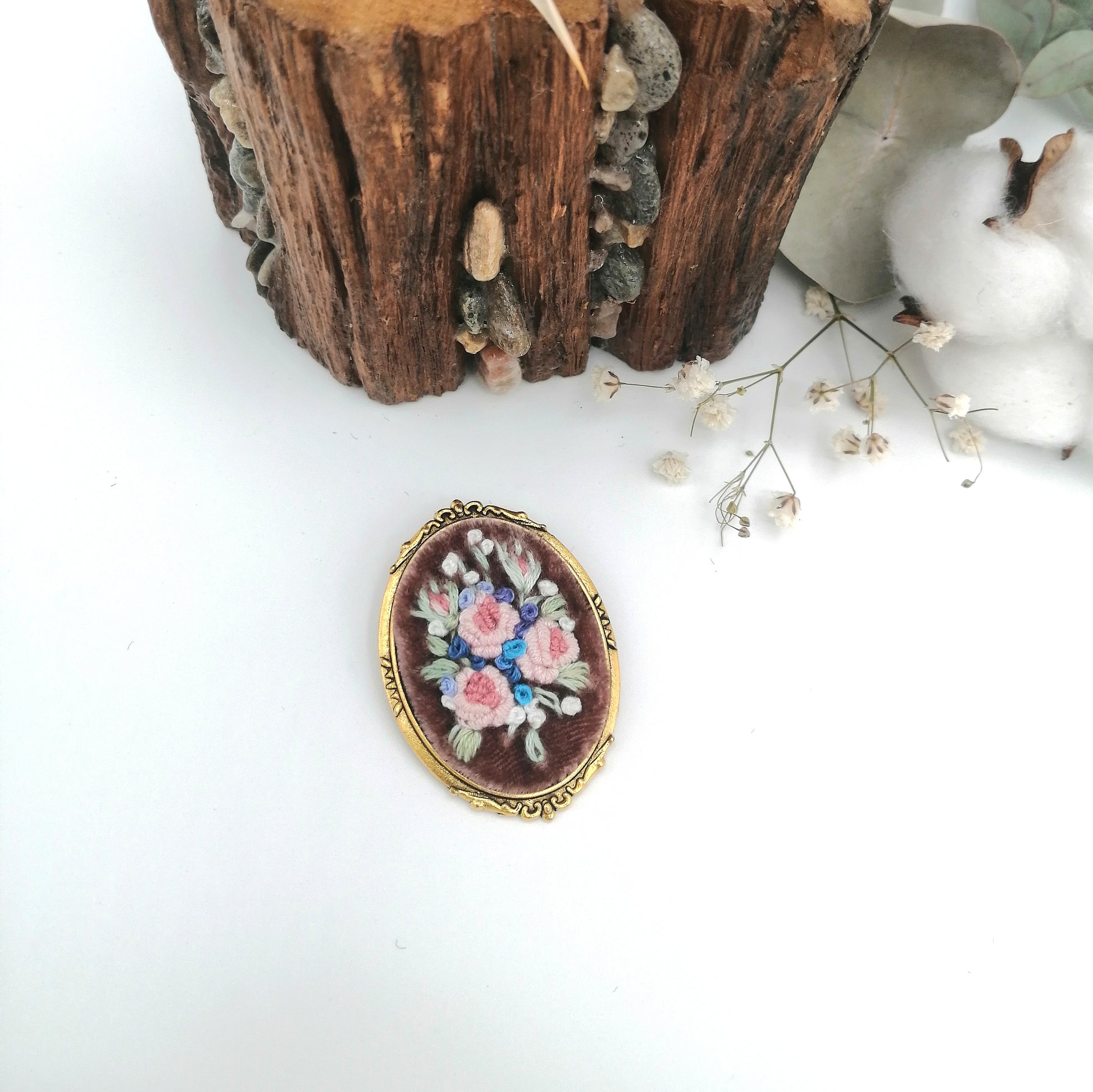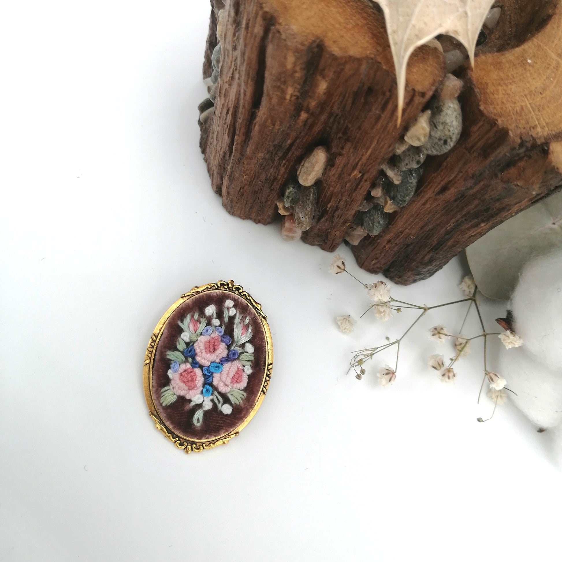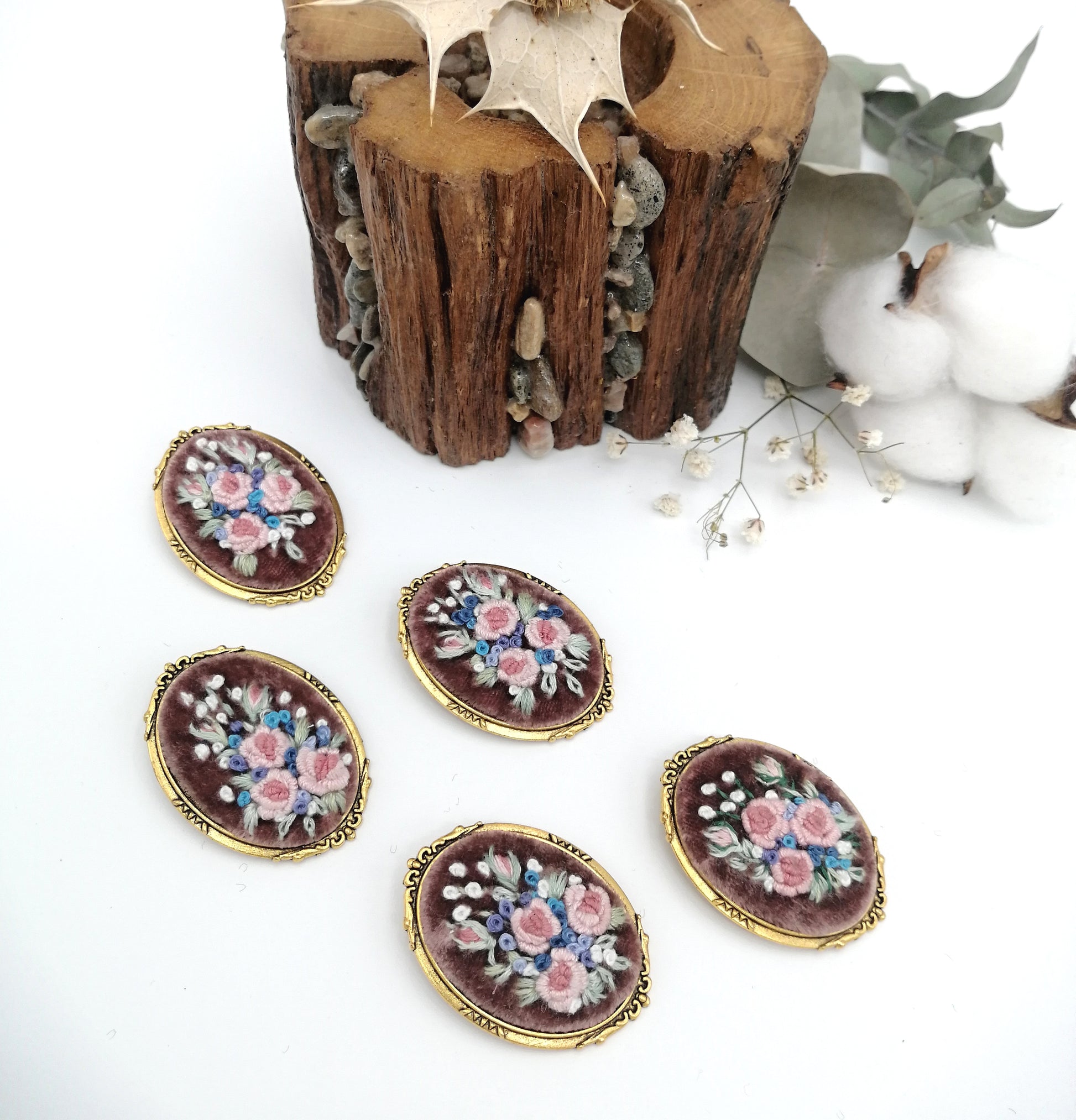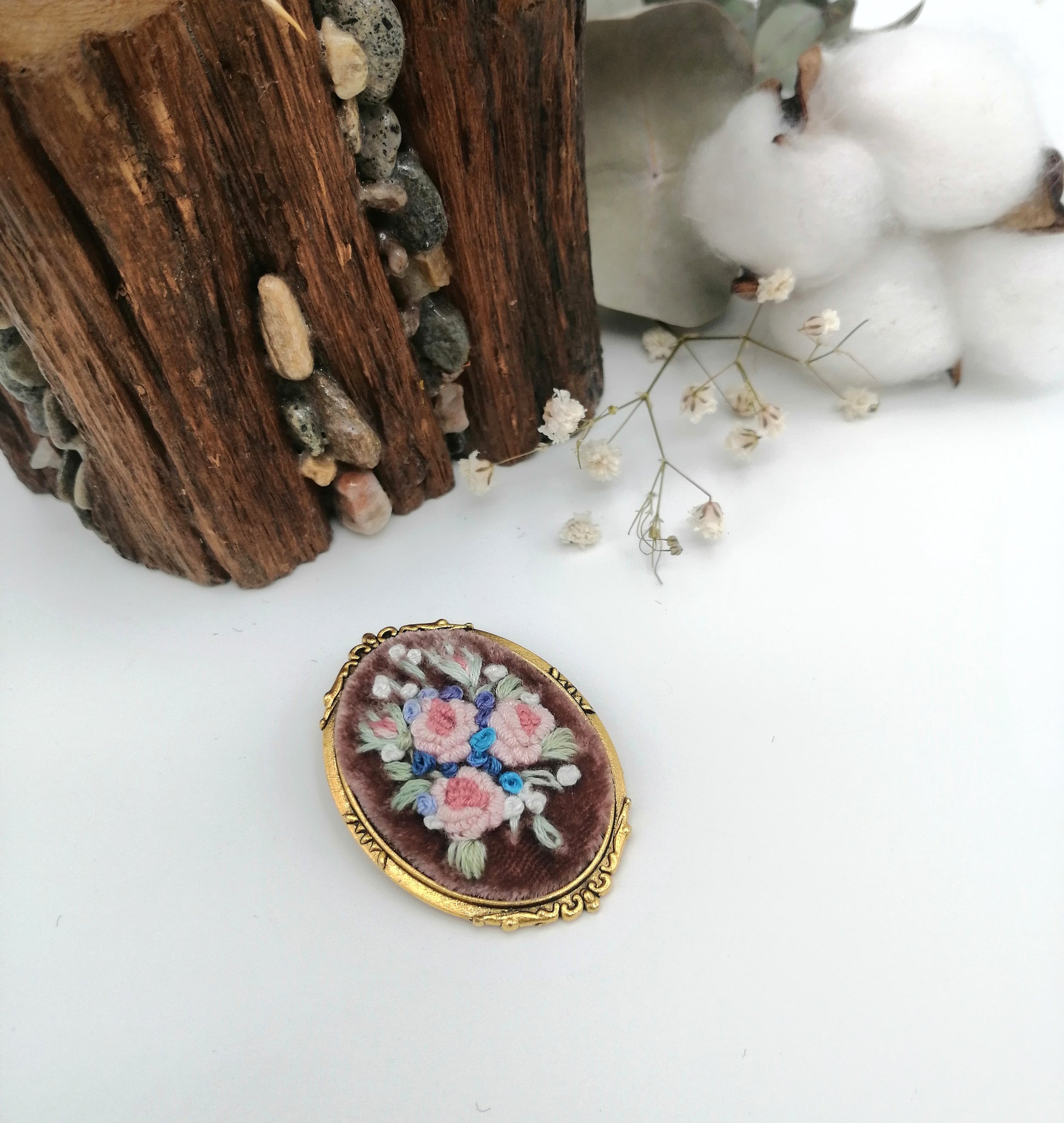 Broșa brodată manual pe catifea de matase. Dimensiuni: aproximativ 38x50 mm